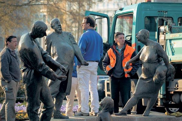Скульптурные персонажи фонтана «Обращение денег», построенного на средства банка «Шпаркассе Ахен» («Ахенская сберкасса»), олицетворяют разное отношение к деньгам