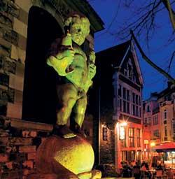 В общем, в результате многочисленных катаклизмов истории получился город, быть может, и нестильный, но чрезвычайно уютный. И этот особенный уют придает Ахену вода. Тут великое множество фонтанов. На любой вкус. Кому-то более по душе придется величественно-барочный на Рыночной площади, увенчанный всемирно знаменитой фигурой Карла (этот искусственный источник воздвигли в 1620 году, а в середине XVIII столетия его переделал по новой моде и украсил фигурами дельфинов местный архитектор Кувен). Кому-то, наоборот, ампирные – в саду за курзалом Элизенбруннен (назван в 1827 году в честь жены короля Фридриха Вильгельма IV) или перед старым зданием Королевских купален. А сами ахенцы, кажется, больше любят маленькие, почти игрушечные фонтанчики с жанровой скульптурой, а именно два – «Обращение денег», где комические фигурки изображают разное отношение к деньгам, и «Кукольный», где марионетки представляют основные «ахенские типы»: профессора, торговку, наездника, театрального артиста… В виде фонтана поставлен и памятник Бахкауфу в назидание и устрашение пьянчужкам.