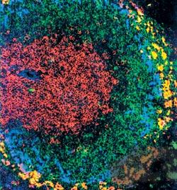 Моноклональные антитела прикрепляются строго только к своим мишенямэпитопам и могут доставлять к ним определенные молекулы. На снимке: участок ткани, в котором разные типы клеток окрашены четырьмя видами моноклональных антител, несущих флуоресцентные маркеры разных цветов