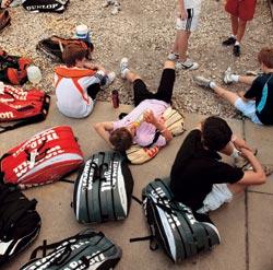 …Ну, а дальше, собственно, начались трудовые будни. Ученики распределились по группам, тренеры очень подробно объяснили им задачи того или иного упражнения, развели по кортам – по четыре человека на одной площадке, – и пошел перестук мячей. Любопытно, что в каждой группе в обязанности ученика поочередно входят и работа с тренером, и сбор мячей, разлетающихся по корту. И учеба вам, и трудотерапия, и закалка спортивного «смирения». Многие родители остаются наблюдать за успехами своих чад и даже снимают процесс на видеокамеры, иные сидят вне кортов под крытыми скамеечками. Вокруг живописно разбросаны спортивные сумки и расставлены те самые фирменные синие термосы... И так далее, до бесконечности – то есть до окончания оплаченного срока.