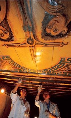 Один из главных сюрпризов поджидал нас в алтаре. «Не могу понять, как они могли датировать это XVIII веком, – говорит Виктор Занозин о росписи кивория – купола на четырех опорах над алтарем. – Сразу видно, что это византийский, греческий мастер». И хотя традиции подобных кивориев в Русской православной церкви нет, отличить XVIII век от XIII наши специалисты могут с закрытыми глазами. У нас такие первоклассные образцы наперечет. При взгляде на лик Спасителя и четырех архангелов в развевающихся одеждах из кивория сразу вспоминается «Ангел Златые власы» и другие домонгольские шедевры из Третьяковской галереи.