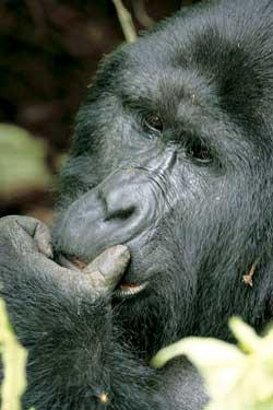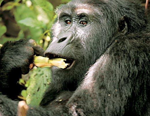 Проводник показывает жестом, что надо остановиться. Прислушиваемся. Метрах в 20 слышатся чавкающие звуки, тихое похрюкивание и хруст веток. Засекаем время. Теперь дорога каждая минута. Предельно осторожно крадемся в сторону звуков. Через минуту среди листвы появляется пара внимательных, осторожных и почти человеческих глаз. Несколько секунд они, не мигая, смотрят в нашу сторону. Мы не спешим. Проводник осторожно приминает растительность, расчищая пространство для съемки. Взору открывается небольшая поляна. Прямо перед нами сидит огромный самец, который неторопливо поедает побеги бамбука. Подтягивая ко рту мощными руками ветку за веткой и перекусывая их пополам, он выедает сердцевину, выплевывая жесткие и «несъедобные» части. Мы стараемся не делать резких движений, но глава семейства искоса поглядывает в нашу сторону, издавая утробные звуки. Метрах в пяти от него самка с маленьким детенышем. Как и все дети, он любопытен, беспечен и суетлив и после обеда пытается устроить себе лежак из бамбуковых листьев, но делает это неумело и неуклюже, почесывая набитый пищей живот. Чуть дальше замечаем еще нескольких горилл, занятых неспешной трапезой. Мы садимся на корточки и наблюдаем за ними. Через полчаса нервозность у горилл проходит и они, кажется, не замечают ни нашего присутствия, ни щелчков затвора фотокамеры. Некоторые молодые животные настолько беспечны, что подходят действительно почти вплотную. Наступает наша очередь нервничать. При каждом их приближении опускаем глаза и замираем. Убедившись, что опасности нет, гориллы продолжают свою трапезу. Когда растительность вокруг была съедена, животные медленно перешли на другое место, продолжая трапезу, прерываясь лишь на короткий отдых или чистку шерсти. Иногда между самками или молодыми самцами возникали короткие стычки. Но до серьезных последствий дело не доходило. При этом главный самец спокойно наблюдал за происходящим и, как правило, не вмешивался в междоусобицу.