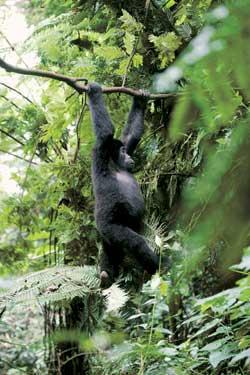 Зажатый с двух сторон горами, лес Бвинди почти непроходим. По видовому разнообразию это, пожалуй, одно из очень немногих мест тропической Африки, где флора и фауна сохранились почти в нетронутом виде, так же как и много сотен лет назад. Огромные сорокаметровые деревья, увешанные бесконечными лианами со свисающей с них густой бахромой, выглядят фантастически. Гигантские папоротники величиной с трехэтажный дом внушительно дополняют картину. Плотные чащи бамбука процветают во влажной атмосфере, преломляя и искажая солнечный свет. В этой богатой экосистеме Африки обитает по меньшей мере 120 разновидностей млекопитающих, шимпанзе, черно-белые колобусы и другие приматы, 346 разновидностей птиц, 14 – змей, 27 – лягушек и жаб, 6 – хамелеонов, 14 – ящериц и 202 разновидности бабочек. Но наша цель – величественные и загадочные большие горные гориллы, или, как их еще называют, «серебристые» (в этом лесу обитают примерно 300—350 особей из 600 существующих в мире). Нам нужно найти животных, приблизиться к ним, провести наблюдения и фотосъемку.