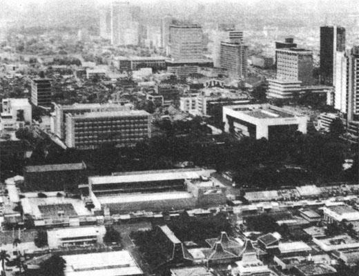 Иностранцы, приезжающие в Джакарту после длительного отсутствия, в один голос утверждают, что город не узнать. В недалеком прошлом был он малоэтажным, ежедневно на долгие часы оставался без электричества. Окруженное болотами устье Чиливунга считалось гнилым местом: малярия и холера косили здесь людей сотнями. Когда в 1963 году в центре города появился десятиэтажный отель «Индонесиа», то его снимали на почтовые открытки как самое убедительное свидетельство приобщения Индонезии к современности. А сейчас это здание теряется в окружении современнейших небоскребов, которые затмили «Индонесию».