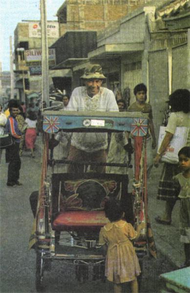 Такая форма обслуживания – особенность Джакарты. На коромыслах по улицам носят еду и прохладительные напитки, питьевую воду, керосин, на плечах разносчика может разместиться и сапожная мастерская, и «цирк» с дрессированными зверями, и магазин канцтоваров, и хозяйственная лавка. Очень удобно, когда стекольщик или зеленщик, москательщик или столяр ходят около твоего забора и предлагают свои услуги. На концах их бамбуковых коромысел висит порой до ста килограммов груза. Гибкое дерево выдерживает. Выдерживают и привычные к тяжести плечи. Но – до поры до времени. Побегай-ка с таким грузом несколько лет под не знающим пощады солнцем, под знобящим дождем!.. Разносчики в среднем живут около сорока лет. Столько же, сколько и велорикши... Достаточно бросить на них взгляд, чтобы стала очевидной горечь добываемого ими хлеба. Глубоко запавшие глаза, паутина морщин, беззубые, ввалившиеся рты, впалая узкая грудь, разбитые ступни ног, никогда не знавших обуви.