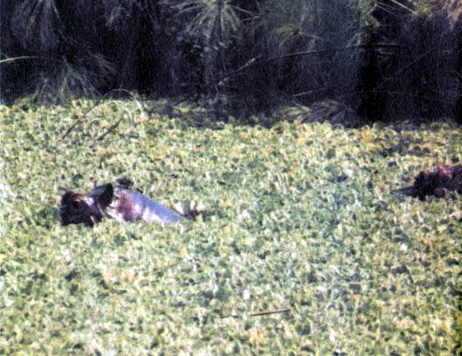 Умиротворяющая внешность бегемота обманчива. В Руинди, где находится самая большая популяция этих животных, нередки несчастные случаи: там погиб хранитель заповедника, убитый бегемотом у порога собственного дома. Говорят, мощными челюстями с остро отточенными клыками бегемоты могут перекусить надвое крокодила. Гиппо и друг с другом не церемонятся: самцы покрыты боевыми шрамами с ног до головы. Мы видели громадного самца, у которого из бока был выхвачен кусок мяса килограммов на десять, а по телу тянулись глубокие шрамы. Самцы с остервенением защищают свою территорию и в бою не щадят сил. Многие наблюдатели сообщали о трагических последствиях таких схваток между бегемотами...