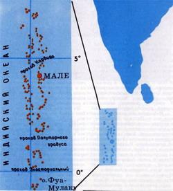 Я раскрыл купленную нами карту Мальдивов. Сильва согласился, что архипелаг лежит как раз на пути мореплавателей, желавших обогнуть южную оконечность Азии. Пролив шириной 40 миль, отделяющий Индию от Цейлона, то бишь Шри-Ланки, опасен из-за обилия рифов и отмелей. Огибая Индийский субконтинент, парусные суда должны были спускаться на юг достаточно далеко, чтобы миновать также Шри-Ланку, а тогда им неизбежно следовало искать проход в длинной цепочке Мальдивских островов. На обычной карте цепочка эта смотрится как рассыпь безобидных зернышек; подробная навигационная карта рисует совсем другую картину. Моим глазам предстала весьма коварная преграда. Никакой адмирал не смог бы выбрать лучшей позиции для минного поля, чтобы перекрыть морские пути южнее этой оконечности Азии. На 600 миль с севера на юг из пучин Индийского океана вздымается острый горный хребет. На поверхности моря он увенчан двумя рядами коралловых рифов, песчаных отмелей и атоллов. Этот двойной барьер сулит большие неприятности мореплавателям. Острова так незначительно выступают над водой, что не будь кокосовых пальм, они оставались бы невидимыми до той минуты, когда судно будет уже во власти прибоя. И только в южном конце длинной коралловой баррикады открываются два пролива, допускающие безопасное сообщение между западным и восточным берегами полуострова Индостан.