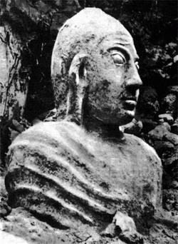 Каменное изваяние мужчины с удлиненными ушами и пучком волос!