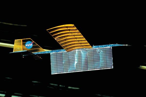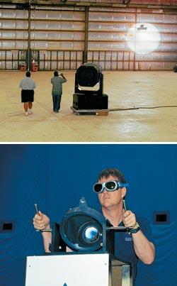 Прожектор передает энергию для пропеллера радиоуправляемой модели самолета (NASA, 2002 год). Но из нескольких киловатт мощности прожектора солнечная батарея принимает и пускает в дело лишь десятки ватт. Год спустя вместо прожектора уже использовался лазер, благодаря чему удалось повысить КПД и сократить размер солнечной батареи. Фото: TOM TSCHIDA/DERC/NASA (х2)