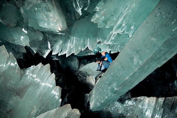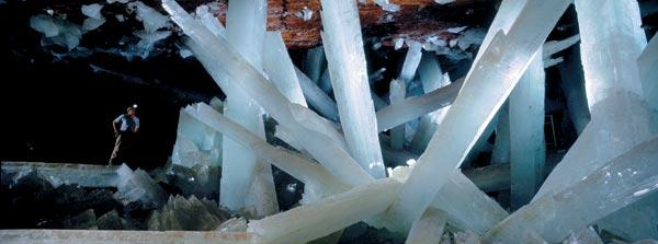 Находка, безоговорочно признанная уникальной всеми специалистами мира, была сделана в 2000 году на севере Мексики , в районе, где более 200 лет добывают цинковую, свинцовую и серебрянную руды. Разрабатывая тоннель на глубине 300 метров, рабочие наткнулись на полость с огромными призматическими кристаллами. Далее, по ходу тектонического разлома, располагались еще две схожие полости. Детально исследовать находку сразу не смогли из-за высокой температуры – около 60 °С и 100-процентной влажности. Возможность ее осмотреть появилась позже, когда разгерметизированная пещера немного остыла. Она оказалась буквально сплошь поросшей кристаллами гипса, самые крупные из которых достигали длины 13 метров. Гипс – минерал мягкий. Его твердость по шкале Мооса соответствует 2. Но мегакристаллы оказались настолько прочными, что выдерживали вес человека.
