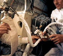 А вот на кораблях «Джемини» и «Аполлон» был применен иной подход к обеспечению кислородом. Его хранили в жидком виде и подавали для дыхания через контур газификации. Одновременно кислород использовался в топливных элементах для выработки электроэнергии в прямой реакции с водородом. Так же устроено снабжение кислородом и на космических челноках «Спейс шаттл». У них нет солнечных батарей, так что кислород нужен не только для дыхания экипажа, но и для работы электрооборудования. Его запас в значительной мере определяет возможную продолжительность полета.