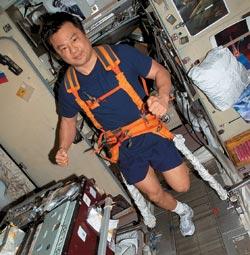 Командир 10-й экспедиции на МКС астронавт Лерой Чиао тренируется на беговой дорожке в модуле «Звезда». Фото: NASA
