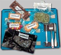 Космические продукты. На пакете с сублимированным протертым шпинатом (вверху справа) виден клапан для воды. Фото: NASA