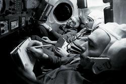 Сегодня это кажется странным, но всего полвека назад медики вовсе не были уверены, что человек сможет пережить условия космического полета. Никто не знал, как подействуют на организм перегрузки, невесомость, космическое излучение, сознание оторванности от Земли. В фантастическом рассказе «Лунная бомба», опубликованном еще в 1926 году, Андрей Платонов приводит сообщения с борта первого космического аппарата инженера Крейцкопфа, который отправился облететь Луну: 7. Звезды физически гремят, несясь по своим путям... Передайте, что я у источников земной поэзии... Здесь страшно, тревожно и все понятно...