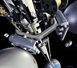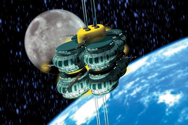 Так в NASA представляют космический лифт конца XXI века. Вид на пересадочную станцию на геостационарной орбите