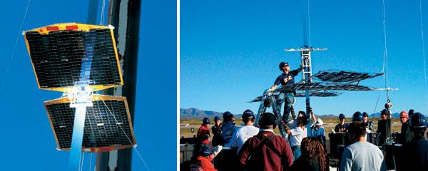 Подъемник, построенный командой Мичиганского университета (справа), впервые поднялся на высоту 60 метров, получая энергию только от солнечных батарей. На это ушло 6 минут 40 секунд при зачетном времени 1 минута. Самым быстрым стал подъемник, созданный в Университете провинции Саскачеван (Канада). Он лишь на пару секунд не уложился в отведенный норматив. На снимке внизу: последние приготовления перед запуском канадского прототипа космического лифта. Обратите внимание, что для подъема используется не трос, а тонкая широкая лента. Это избавляет от проблем с ориентацией аппарата