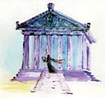 «…я отплыл в Тир Финикийский, узнав, что там есть святилище Геракла. И я видел это святилище, богато украшенное посвятительными дарами. Среди прочих посвятительных приношений в нем было два столпа, один из чистого золота, а другой из смарагда, ярко сиявшего ночью» («Истории», Книга II «Евтерпа»). На самом деле то было, очевидно, святилище финикийского бога Мелькарта. Об архитектуре его не осталось достоверных сведений, так что здесь мы, собственно, видим изображение знаменитого Соломонова храма в Иерусалиме. Ряд авторитетов, в том числе Иосиф Флавий, считают, что здания походили друг на друга как две капли воды