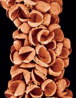 Мхи, папоротники, хвощи и плауны – первопроходцы сухопутной среды обитания. Своим успехом они во многом обязаны мелким летучим спорам, которые позволили им размножаться вне водной среды, расселяться по воздуху и выживать при засухе. Споры этих растений защищены тремя оболочками, а на внешней есть орнамент из шипов, колец, бляшек, по которому можно определить род и даже вид растения. Предполагают, что этот орнамент служит для лучшего заякоривания в той среде, где спорам предстоит прорастать. Зачастую «украшения» расположены не на всей поверхности, а только на одной полусфере, что сказывается на ходе прорастания: трещины, сквозь которые содержимое споры выходит наружу, располагаются именно в той ее части, где орнамента нет. Шероховатости на оболочке могут играть и роль в распространении спор. Так, у хвоща они снабжены длинными выростами в виде нитей с булавовидными утолщениями на концах. Этими нитями споры сцепляются в комки и так разносятся по воздуху. Попав в подходящее место, они прорастают и оказываются способными к перекрестному скрещиванию, которое было бы невозможно, если бы спора прорастала в одиночестве.