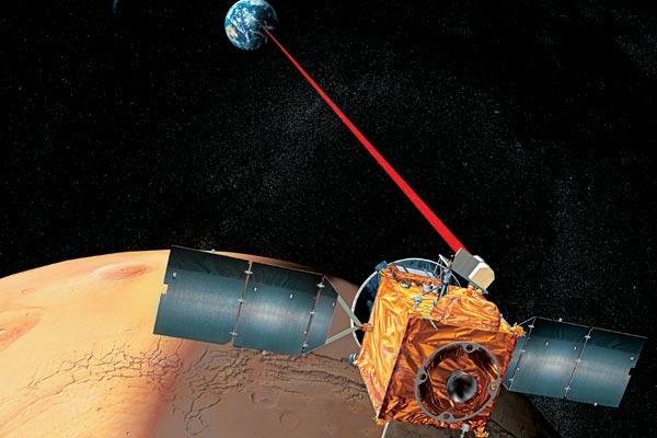 Самой высокой скоростью межпланетной передачи данных может сегодня похвастаться аппарат Mars Reconnaissance Orbiter, вышедший на орбиту Марса 10 марта 2006 года. Он оснащен 100-ваттным передатчиком с трехметровой параболической антенной и может передавать информацию на скорости до 6 мегабит в секунду. Доставить к Марсу более крупный и мощный передатчик пока затруднительно. Однако есть принципиально иной подход к увеличению скорости передачи данных – использовать вместо радиоволн оптическое излучение. Длина волны лазерного излучения в десятки тысяч раз меньше, чем в радиодиапазоне. Поэтому расходимость лазерного луча получается значительно меньшей. Это позволит существенно поднять скорость передачи данных при более низком энергопотреблении. Но у лазерной связи есть и недостатки: она нуждается в более точном нацеливании передатчика, и, кроме того, на ее работоспособность существенным образом влияют погодные условия, в первую очередь облака. Поэтому межпланетная лазерная связь будет, скорее всего, поддерживаться с орбитальных аппаратов. Впервые лазерная связь в космосе была осуществлена 21 ноября 2002 года. Европейский спутник дистанционного зондирования Земли SPOT 4, находящийся на орбите высотой 832 километра, установил контакт с экспериментальным космическим аппаратом Artemis, обращающимся на высоте 31 000 километров и передал снимки земной поверхности. А недавно Лаборатория Линкольна в Массачусетсском технологическом институте (MIT) совместно с NASA приступила к разработке лазерной системы дальней космической связи. Первый тестовый коммуникационный лазер планируется отправить к Марсу в 2009 году. Ожидается, что этот 5-ваттный передатчик в период сближения планет обеспечит скорость передачи данных до 30 мегабит в секунду.