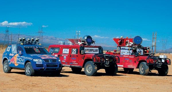 Роботы-автомобили с искусственным интеллектом перед гонкой DARPA по пересеченной местности в 2005 году. Синий – победитель Stanley – от Стэнфордского университета, красные – H1ghlander и Sandstorm – от Университета Карнеги-Меллона