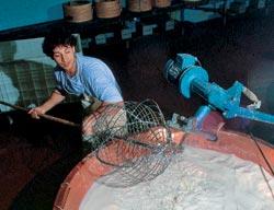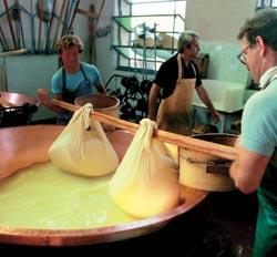 Делают сыр из непастеризованного молока утреннего и вечернего удоев. Причем очень важно, чтобы молоко вечернего удоя было несколько обезжирено путем удаления отстоявшихся сливок. Молоко доставляется на завод не позднее, чем через 2 часа после доения, его сквашивают специальной сычужной закваской – ферментом из желудочного сока молочного теленка. Приблизительно через десять минут молоко разделяется на сыворотку и сырный сгусток. Сыворотку сливают. А сырный сгусток тщательно измельчают длинной палкой, на языке сыроваров почему-то называемой иглой. Эту массу затем выкладывают в большие медные котлы и подогревают сначала достаточно медленно до 45 градусов, а затем быстро до 55. Такой способ температурной обработки позволяет максимально удалить воду из будущего сыра. По окончании этого процесса гранулы откладываются на дне котла, образуя компактную массу.