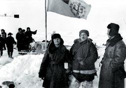 Летчик Г. Власов, И. Папанин и капитан ледокола «Таймыр» А. Остальцов на станции «Северный полюс-1»