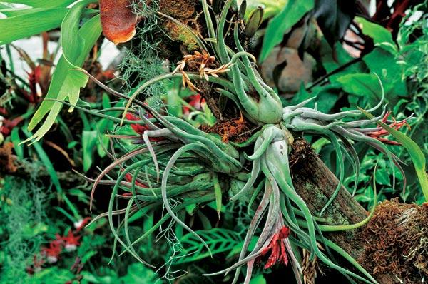 А как же эпифиты достают воду? Для тех из них, кто проводит жизнь между небом и землей, единственный источник влаги – дожди и туманы. Правда, зачастую и этот источник ненадежен, вот почему эпифиты создают запасы. Для этого у растений есть разные приспособления: «кувшины» из листьев, гигроскопические губчатые ткани, полости в стеблях. Бывает, что все растение целиком сложено из гигроскопической ткани, она разбухает после дождя, а в период засухи сморщивается настолько, что растения кажутся погибшими. На самом же деле они будто впадают в «спячку» и ждут следующего оживляющего дождя. Такая особенность присуща, например, некоторым эпифитным папоротникам, в том числе американскому папоротнику, широко распространенному в субтропической и тропической зонах Нового Света. В семействе бромелиевых, к которому относится ананас, есть растение, не похожее ни на одно из родственников. Оно называется тилландсия уснеевидная, что отражает внешнее сходство этого представителя с лишайником-бородачом – уснеей. В местах обитания все деревья увешаны длинными клочьями тилландсии. В угоду эпифитному образу жизни она лишилась листьев и корней и впитывает влагу с помощью волосков, которые покрывают всю поверхность ее побегов.