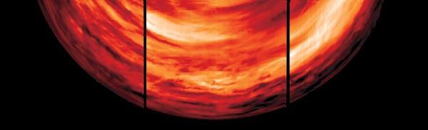 Одно из наиболее красивых изображений спектрометр VIRTIS получил 29 июля при съемке Венеры с дальней дистанции – около 65 тысяч километров. На мозаике, составленной из трех снимков, хорошо видна сложная структура атмосферы. По внешнему виду она больше напоминает атмосферы планет-гигантов, чем земную. Снимки сделаны с интервалом около 30 минут и уже заметно не совпадают на границах. Это показывает, насколько динамична атмосфера Венеры. При том, что сутки на планете длятся 243 земных дня, ветер успевает обойти всю планету по экватору примерно за четверо наших суток. Это соответствует скорости более 100 м/с. Правда, такие скорости ветра наблюдаются только в средних и верхних слоях атмосферы. Как показали данные спускаемых аппаратов, в глубине атмосфера намного спокойнее, скорость ветра у поверхности составляет всего около 1 м/с.