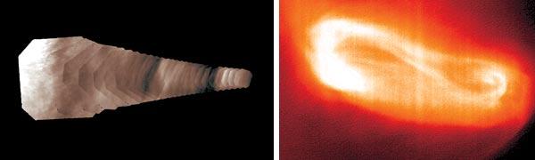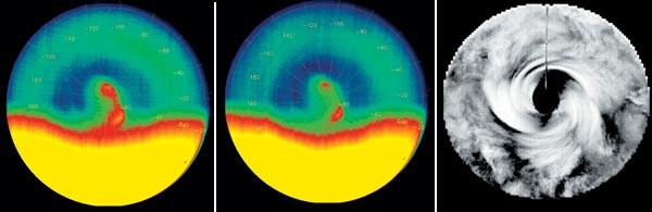 Ученые не ошиблись с выбором параметров рабочей орбиты, и новые открытия не заставили себя долго ждать. 29 мая станция провела очередную инфракрасную съемку южной полярной области, и там был обнаружен вихрь весьма неожиданной формы. Обычно атмосферные вихри, от смерчей до циклонов, формируются вокруг некоего центра, в котором вращение отсутствует. Появление этой «зоны спокойствия» в самом центре урагана (так называемого «глаза бури») объясняется соображениями симметрии: здесь у ветра просто нет предпочтительного направления, в котором он мог бы дуть. Но на южном полюсе Венеры неожиданно была обнаружена странная структура с двумя центрами, которые сложным образом связаны друг с другом.