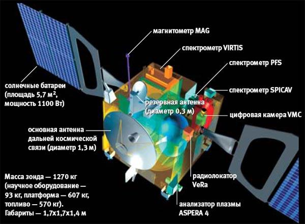 Один из важнейших инструментов Venus Express – универсальная широкоугольная камера VMC (Venus Monitoring Camera), работающая в диапазонах от ультрафиолета до ближнего инфракрасного излучения. В ее конструкции использованы технические решения, которые ранее применялись при разработке камеры высокого разрешения HRSC на аппарате Mars Express и системе инфракрасного наблюдения OSIRIS на автоматической межпланетной станции Rosetta, стартовавшей в 2004 году навстречу комете Чурюмова—Герасименко. Кстати, со станции Rosetta позаимствованы (с модификациями, конечно) и остальные три научных прибора Venus Express: магнитометр MAG, аппаратура для радиозондирования VeRa и сканирующий спектрометр VIRTIS, способный наблюдать все слои атмосферы Венеры и строить тепловые карты ее поверхности.