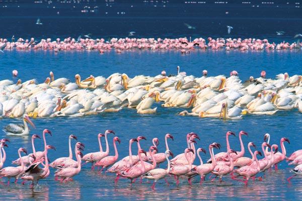 Содовые озера – не самое благоприятное для жизни место. Обычно их населяют лишь беспозвоночные и синезеленые водоросли. Но именно такие мелководья привлекают к себе фламинго. Озеро Накуру – место сбора малых фламинго. Здесь их бывает больше, чем где-либо на Земле, – миллионы особей. Садясь и взлетая вблизи береговой линии, мириады существ образуют постоянно меняющийся узор различных оттенков розового цвета.