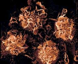 Форма раковых клеток разнообразна и порой бывает весьма причудлива, как у этих ворсинчатых клеток, возникающих при одной из разновидностей лейкемии