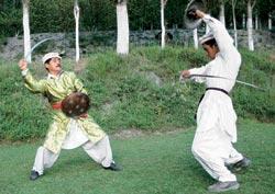 Оказалось, что артист знал все самые укромные и живописные поляны в округе. На одной из них, естественно, с видом на горы, уже расположился небольшой оркестрик. Отец и сын, взяв в руки сабли и небольшие щиты (кавалерийские, как мне объяснили), пошли потихоньку описывать вокруг нее круги. Постепенно плавные движения сменились настоящей схваткой на мечах – театрализованной, но мало похожей на танец. Старший танцор быстро подустал, но молодой явно не желал отпускать его, вовсю наслаждаясь диковинной «дуэлью»…