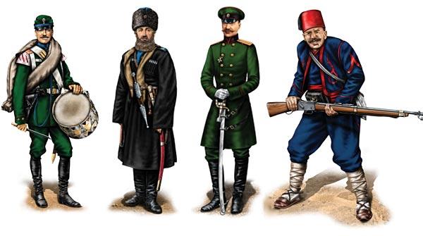 Барабанщик 10-го Малороссийского гренадерского полка, казак Терского казачьего войска, офицер-артиллерист и онбаши («десятник») турецкой пехоты времен Балканской войны 1877—1878 годов