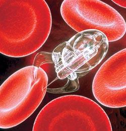 Фантастический наноробот «делает укол» эритроциту. Хотя подобные рисунки довольно наглядны, они весьма далеки от реальных современных нанотехнологий
