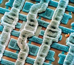 Фрагмент микросхемы памяти. Под утолщением на среднем проводнике находятся транзисторы, которых на кристалле несколько сотен миллионов. Увеличение около 10 000х