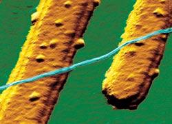 Самый тонкий в мире провод из углеродных нанотрубок на фоне платиновых электродов. Толщина провода всего около 10 атомов. Увеличение около 500 000х