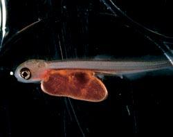 У выклюнувшейся личинки около 80% от общего веса составляет желточный мешок, за счет которого она и питается