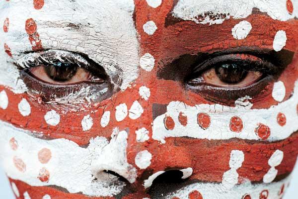 Последним сурма пользуются меньше и бережнее. Красная краска у них скорее праздничная. Этот цвет – в большей степени привилегия женского и отчасти детского «макияжа», нежели мужского, хотя и сильный пол также изредка пользуется ею. Охрою наносят яркие, доминантные, точки, а также заполняют или оттеняют контуры узоров, прорисованных на теле пальцами. Если белый фон обычно блеклый и полупрозрачный (сквозь засохший мел заметно просвечивает кожа), то пятна охры обычно яркие, сочные. Это благодаря добавлению в краску животного масла или жира. Зеркалами сурма не пользуются, а потому узоры наносят не сами себе, а друг другу, и тут, конечно, есть свои выдающиеся мастера.