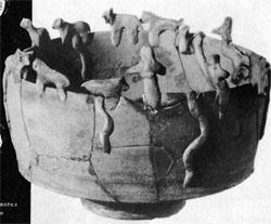 Как оказалось, фигурка животного располагалась по верхнему краю какого-то сосуда. Более того, рядом располагалась еще одна статуэтка, дальше – третья... Расчистка всей находки затянулась на несколько дней, и все мы с нетерпением ждали результатов. И вот после кропотливой реставрации найденных фрагментов перед нами стоял вроде бы обычный бытовой сосуд средних размеров, но внутри его находилось пять различных форм, а по венчику располагались скульптурные фигурки, безусловно, имеющие культовое значение, – быка-коровы, козы-овцы, верблюда, птицы, возможно, собаки, лягушки или тюленя. Помимо животных и птиц, здесь были две человеческие фигуры (одна из них – со сложенными на спине руками – очень похожа На фигуры пленных, стоящих перед царем Дарием на рельефе Бехистунской скалы)... А от дна сосуда к фигуркам животных снова тянулись, извиваясь, змеи.