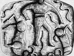 Это сочетание людей и животных со змеями и фантастическими драконами скорее всего связано с религиозно-культовыми воззрениями, распространенными среди местных племен. Думается, что в устных преданиях и мифах, передававшихся из поколения в поколение, широко была распространена тема борьбы добра и зла, нашедшая свое отражение в печатях-амулетах.