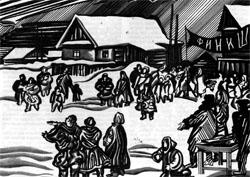 Внук расплакался. Старуха Мамушка напустилась на Деда. А он сорвал с гвоздя кухлянку, перекинул через плечо ружье и, не взглянув на Внука, громко хлопнул дверью...