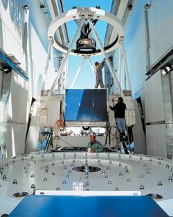 Как стало ясно из упоминания о Большом бинокулярном телескопе, перешагнуть 6-метровый барьер удалось и цельным зеркалам. Для этого надо было просто перестать полагаться на жесткость материала и поручить поддержание формы зеркала компьютеру. Тонкое (10—15 сантиметров) зеркало укладывается тыльной стороной на десятки или даже сотни подвижных опор – актуаторов. Их положение регулируется с нанометровой точностью так, чтобы при всех тепловых и упругих напряжениях, возникающих в зеркале, его форма не отклонялась от расчетной. Впервые такая активная оптика был опробована в 1988 году на небольшом Северном оптическом телескопе (Nordic Optical Telescope, 2,56 метра), а еще через год – в Чили на Телескопе новых технологий (New Technology Telescope, NTT, 3,6 метра). Оба инструмента принадлежат Европейскому Союзу, который, обкатав на них активную оптику, применил ее для создания своего главного наблюдательного ресурса – системы VLT (Very Large Telescope, Очень большой телескоп), четверки 8-метровых телескопов, установленных в Чили .