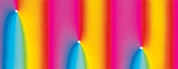 Компьютерная визуализация математической функции, описывающей запуск циркадного ритма у дрозофилы. Яйца, личинки и куколки дрозофил от момента зачатия содержались в полной темноте и при постоянной температуре. В этих условиях достаточно единственной вспышки света, чтобы запустить «внутренние часы»: через каждые 24 часа после вспышки будет происходить массовое вылупление взрослых мух из куколок (белые точки). Фото: SPL/EAST NEWS