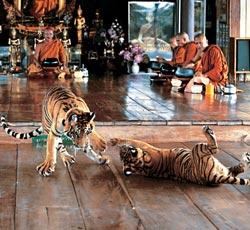 Леса провинции Канчанабури населяет самая большая в Таиланде популяция тигров. Охота на них в стране запрещена, а значительная часть принадлежащих им джунглей входит в национальные парки, но ни то, ни другое браконьеров не останавливает. Шкуры пользуются спросом у любителей украшать свои дома охотничьими трофеями, а кости, усы и прочие части тела тигра широко используются в традиционной восточной фармакопее. Поскольку в наше время тигры стали редки везде, цена на это сырье резко возросла. Браконьер может выручить за убитого взрослого зверя почти 6 000 долларов, что составляет доход тайского крестьянина за несколько лет изнурительной работы. Когда жертвой такого промысла становится тигрицамать, тигрята достаются ее убийце в качестве бонуса. Но даже если им удастся убежать в джунгли, шансов выжить у них мало: у взрослого тигра нет врагов, кроме человека, но у котенка их предостаточно. А главное – детенышам очень трудно добывать себе пищу. В поисках таковой маленькие тигры нередко приходят к людям и создают для них массу проблем. Но с появлением монастыря-приюта выход был найден: тигрят стали отдавать монахам. Святым людям виднее, как им помочь.