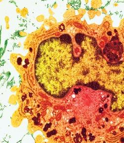 Макрофаг – большая клетка, постоянно меняющая свою форму. Ее задача – собирать «мусор», поедать вредных микробов, их переваривание происходит в темно-коричневых пузырьках на периферии клетки. В центре – громадное зеленоватое ядро