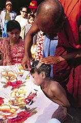 Сама церемония проста – мальчика должны были постричь и одеть в монашескую одежду. Настоятель монастыря прочитал ему молитву и дал наставления о том, как надо себя вести сообразно буддийской традиции. Все – просто и буднично. Мать мальчика вместе с дедушкой держали полотенце, на которое падали волосы будущего послушника, а монах ловко брил его склоненную голову. После молитвы он начал разбрасывать мелкие деньги для гостей, поскольку раздача милостыни – одно из краеугольных положений буддизма.