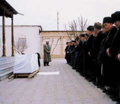 Важнейшим пунктом мусульманского погребального обряда является расположение тела усопшего по сторонам света. Едва человек преставился, над ним читают молитву «Калиматшахад», дают ему глоток холодной воды, в которую добавляют священную воду Зам-Зам или сок граната и кладут его тело на спину таким образом, чтобы ступни были обращены в сторону Мекки. Так же, как и в христианском обряде, умершего обмывают, желательно три раза: водой, содержащей кедровый порошок, водой, смешанной с камфарой, и – чистой. Омывающим могут быть близкий родственник и его помощник. Жена тоже может обмывать тело своего мужа. Покойный должен быть окутан саваном, изготовленным из белого полотна или ситца. Узлы, завязанные на саване, развязываются при опускании тела в могилу. Мусульмане не кладут своих покойников в гроб. Для переноски тела применяют носилки (тобут). Перед погребением, которое обязательно должно состояться до захода солнца, произносится погребальная молитва. Носилки устанавливаются в направлении Каабы – главной мусульманской святыни, куда должна быть обращена и голова упокоенного мусульманина, после чего читается молитва с просьбой об отпущении грехов и милости к нему. Засыпанная могила должна возвышаться над землей на четыре пальца. Затем могилу поливают водой, семь раз бросают на нее горсти земли и читают молитву «Из нее Мы сотворили вас и в нее возвращаем вас, из нее же изведем вас в другой раз».