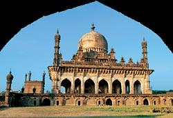 Изящные минареты, узкие арки, обилие мелких деталей, заимствованных из местной традиции, – это усыпальница Ибрагима Адиль-шаха II в Биджапуре. Карнатака, начало XVII века