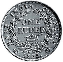 Серебряная рупия ОстИндской компании (калькуттской чеканки). Название монеты происходит от английской транслитерации слова rupya, означающего на хинди, собственно, «серебряная монета»